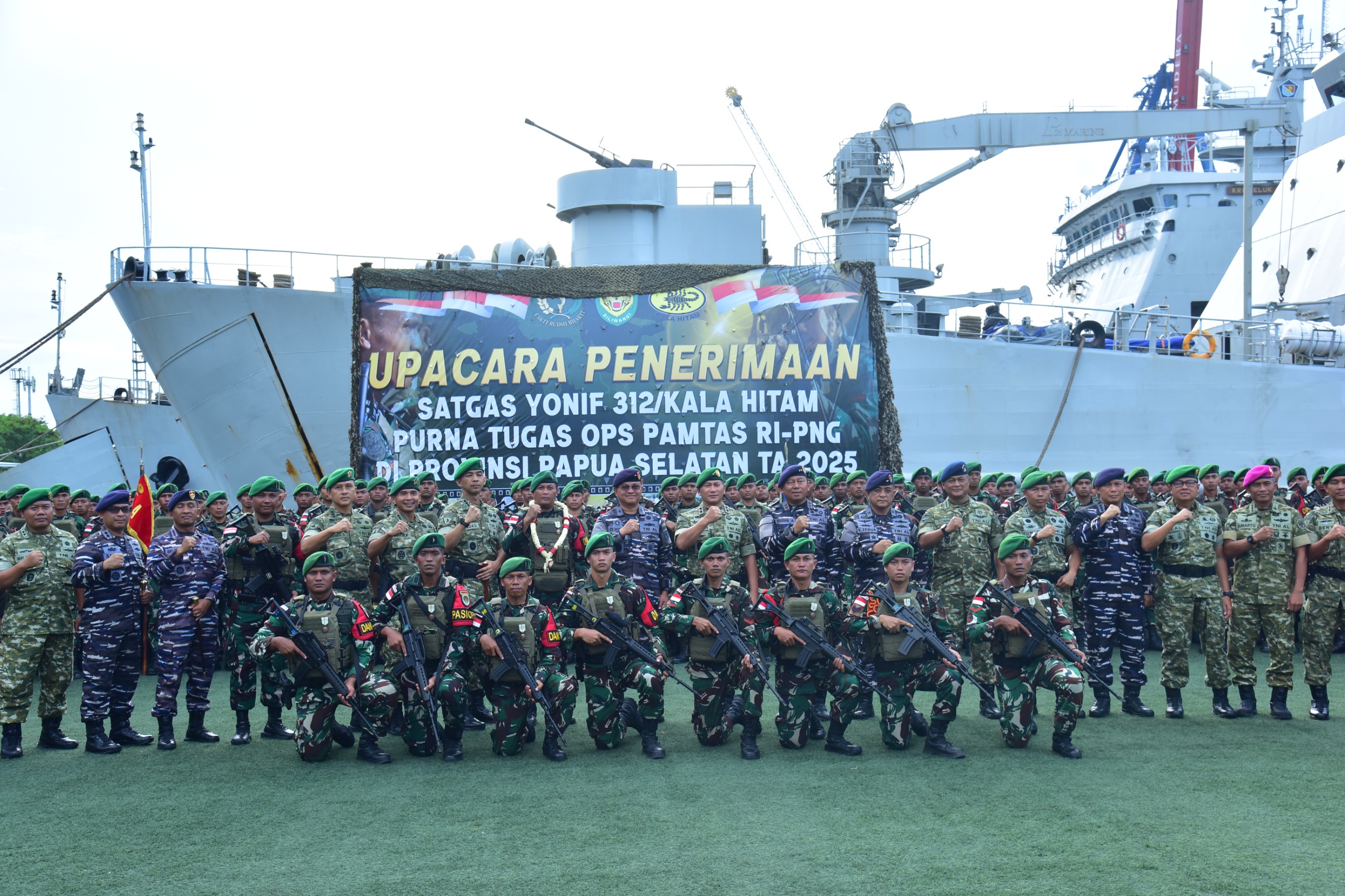 Jurnalmetropol.com, Jakarta — Panglima Komando Lintas Laut Militer (Pangkolinlamil) Laksda TNI Rudhi Aviantara IH., S.E., M.Si., M.Tr.(Han)., CHRMP., menghadiri Upacara Penyambutan Satgas Pamtas RI–PNG Statis Sektor Selatan Yonif 312/Kala Hitam Brigif 15/Kujang II.
