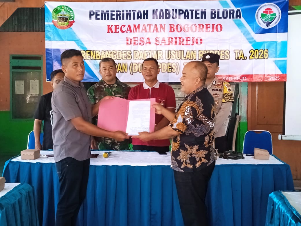 Jurnalmetropol.com, Blora — Pemerintah Desa Sarirejo, Kecamatan Bogorejo, Kabupaten Blora, melaksanakan Musyawarah Perencanaan Pembangunan Desa (Musrenbangdes) dalam rangka penyusunan Daftar Usulan Rencana Kerja Pemerintah Desa (RKPDES) Tahun Anggaran 2026 serta Daftar Usulan RKPDES (DU-RKPDES) Tahun 2027.
